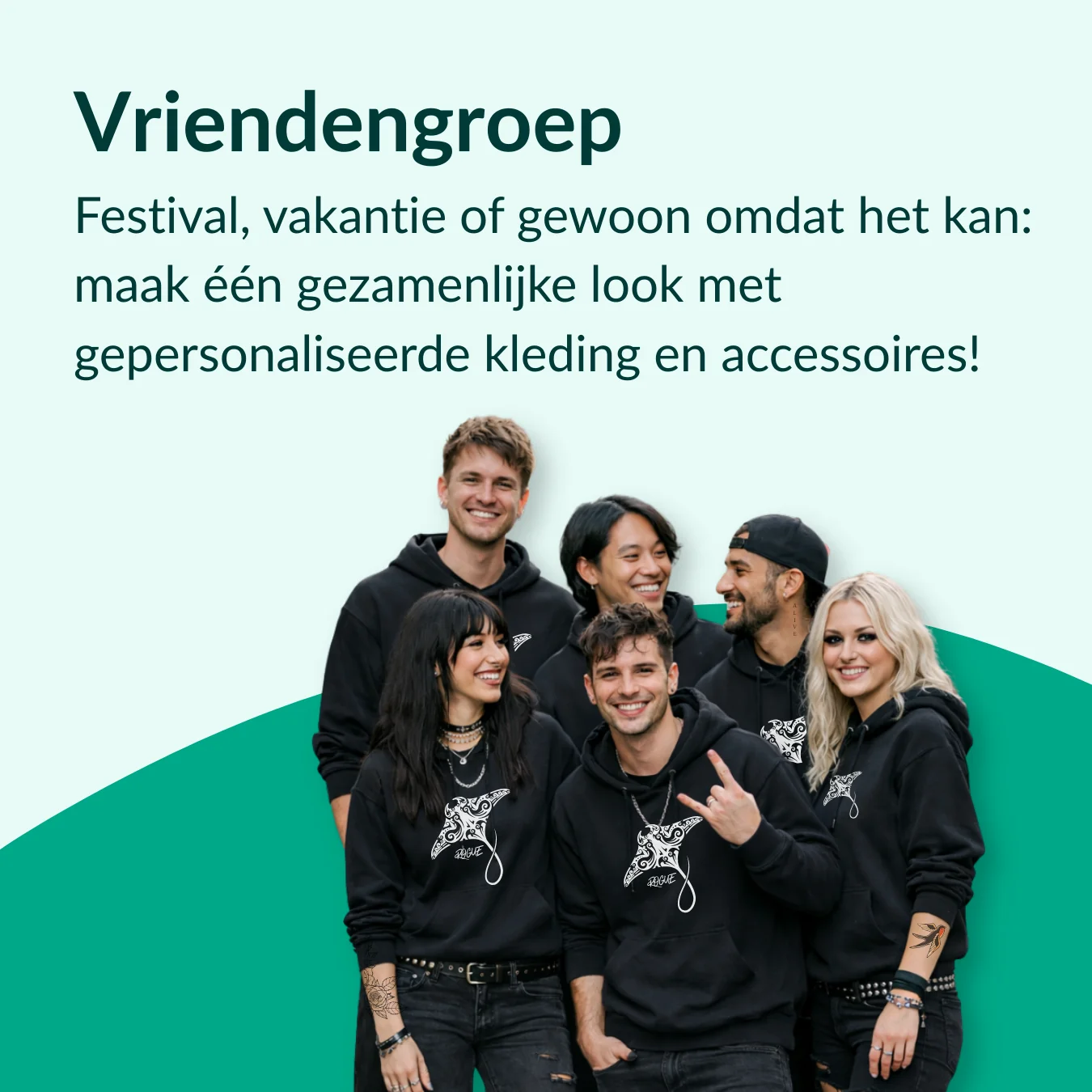 Naast specialist in kleding en ander textiel bedrukken en/of borduren voor bedrijven, sportverenigingen, studentenverenigingen, jaarclubs en scholen is Yourstyle er natuurlijk ook voor vriendengroepen. Of jullie nu op vakantie gaan, een festival bezoeken, een weekend weg plannen, een vrijgezellenfeest organiseren of gewoon iets tofs willen maken als groep: gepersonaliseerde kleding zorgt direct voor eenheid en sfeer. Met matching shirts, hoodies, sweaters of andere merchandise maak je van ieder moment iets extra bijzonders. Zo laat je zien dat jullie bij elkaar horen en heb je meteen een blijvende herinnering aan een leuke tijd samen.