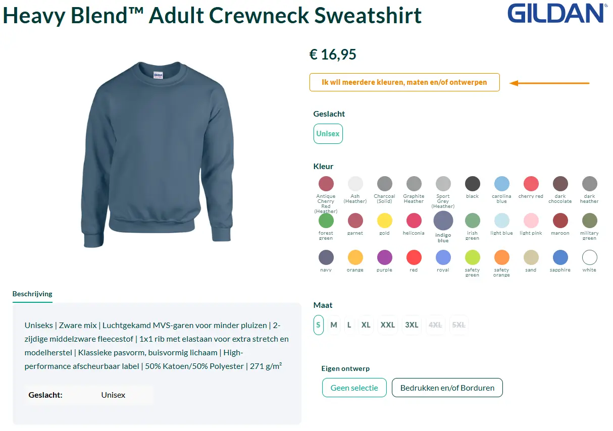Meerdere kleuren, maten en/of ontwerpen nodig? Bespaar enorm veel tijd, geld en energie als je een grote bestelling wilt plaatsen. Als je een bulkbestelling wilt plaatsen op Yourstyle.nl dan raden wij je aan om op een artikelpagina gebruik te maken van de button die op de afbeelding hieronder te zien is bij de oranje pijl. Nadat je op deze button geklikt hebt ga je naar een pagina waar je heel eenvoudig en snel een uitgebreide bestelling van een product kan plaatsen. Op iedere artikelpagina staat deze button. Doe er dus je voordeel mee en bespaar tijd en geld. een ideale combinatie, toch?