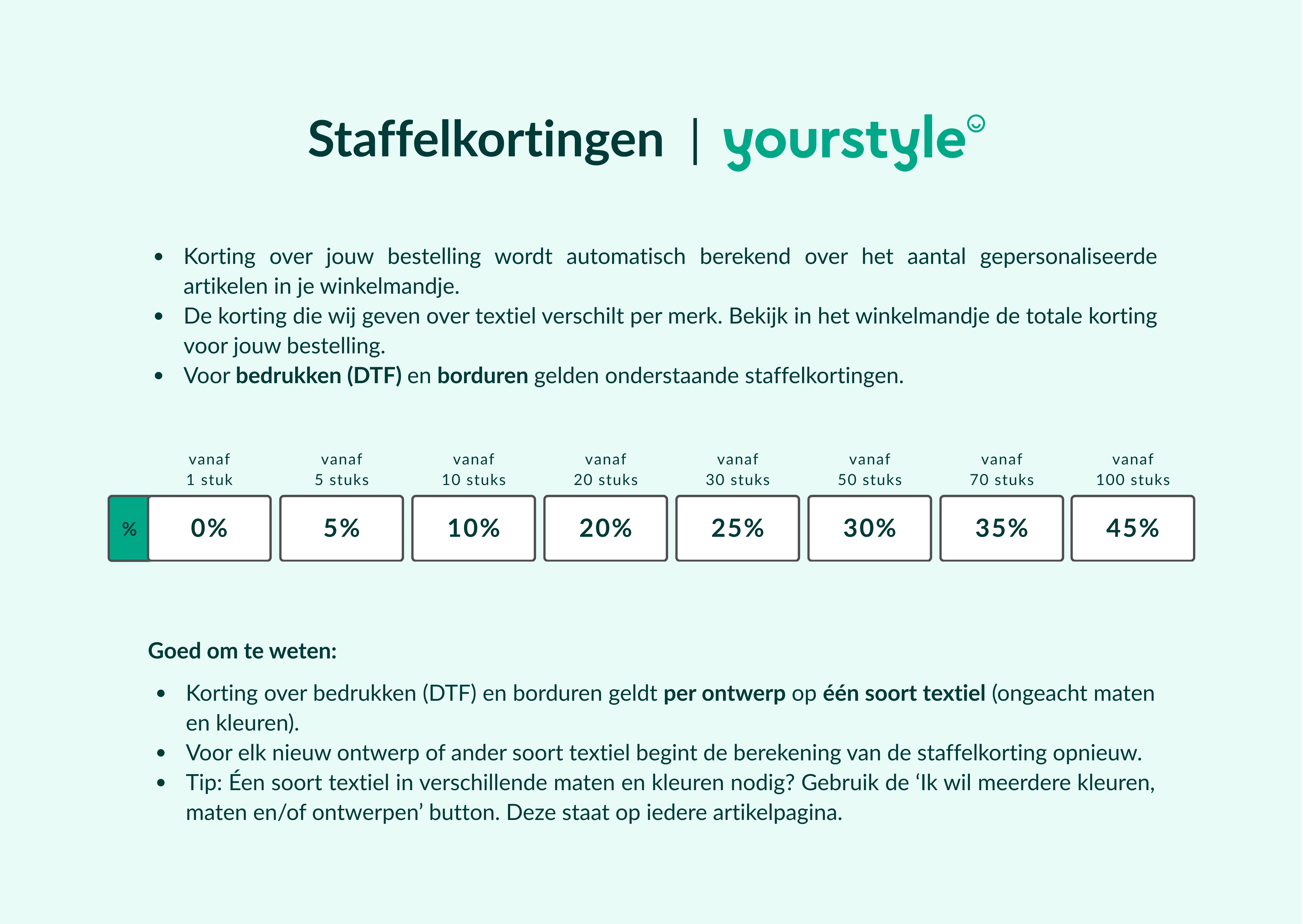 Scoor meer, betaal minder! Hoe meer je bestelt, hoe hoger je korting. Bij Yourstyle wordt de korting automatisch berekend op basis van het aantal stukken textiel en op basis van het aantal bewerkte (bedrukken en/of borduren) artikelen in je winkelmandje. Dat tikt lekker aan! Voor bedrukken (DTF) en borduren hanteren we scherpe staffelkortingen tot wel 45% korting vanaf 100 stuks. Dus of je nu werkkleding voor je team regelt, clubshirts voor je vereniging of merchandise voor je fans? Een grote bestelling loont bij Yourstyle. Hieronder leggen we je onze staffelkortingen aan je uit, door de belangrijkste punten uit te lichten en door een tabel, die de kortingspercentage weergeeft bij bedrukken en/of borduren per 5, 10, 20, 30, 50, 70 en 100 stuks. Vragen over onze staffelkortingen? Neem contact met ons op.